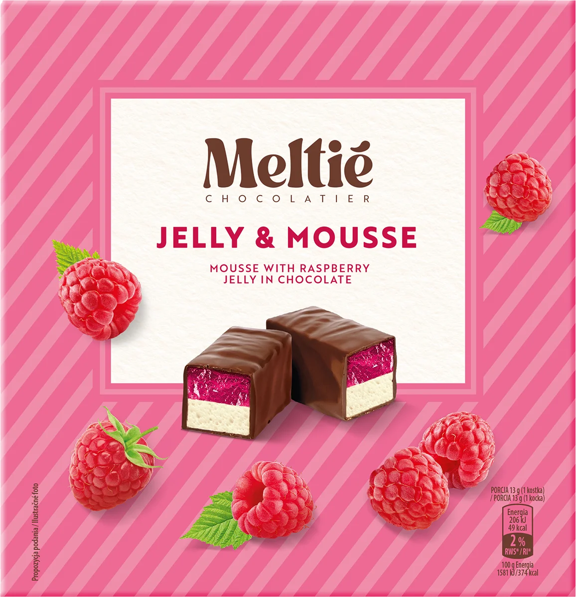 Puszysta pianka w połączeniu z soczystą, owocową galaretką w chrupiącej czekoladzie deserowej