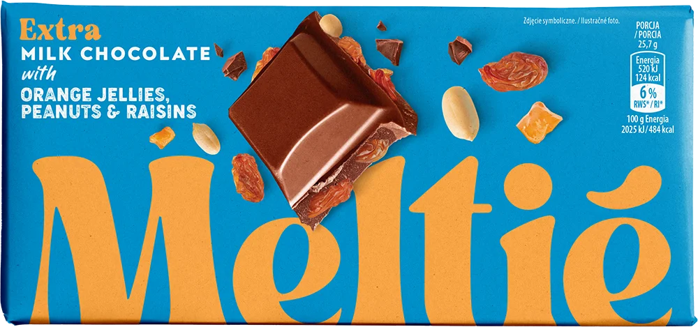 CZEKOLADA MLECZNA Z GALARETKAMI POMARAŃCZOWYMI, ORZESZKAMI ARACHIDOWYMI I RODZYNKAMI